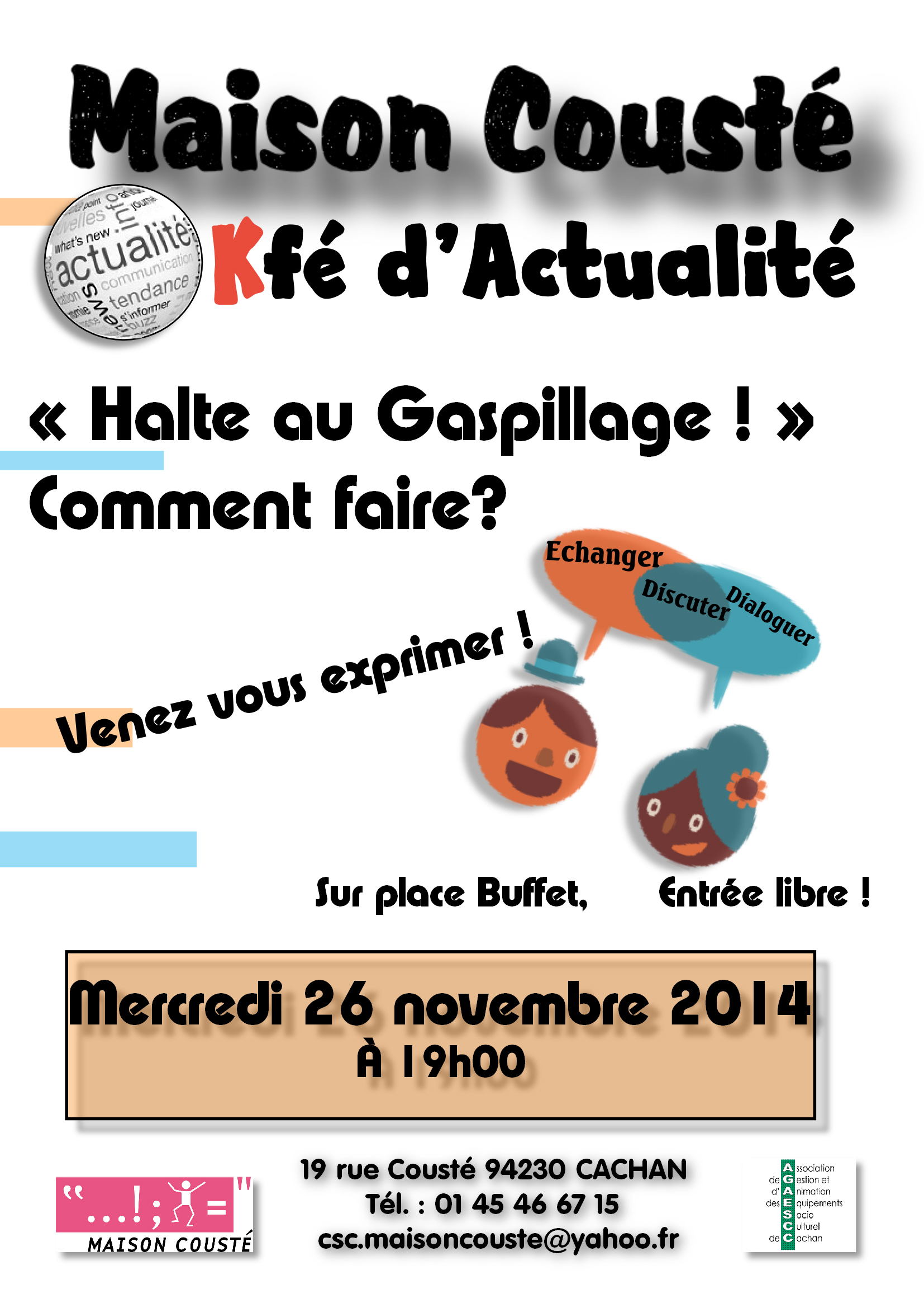 Le kfé d'actualité de la Maison Cousté est une initiative d'habitants, seniors retraités. c'est un groupe de 6 personnes qui proposent des thèmes aux habitants autour desquels ils échangent puis proposent des recomamandations. A la fin de chaque kfé, un zapping d'actualité est proposé, chaque personne présente peut prendre la parole pour dire ce qui l'a touchée dans la semaine de la mise en place du kfé.
